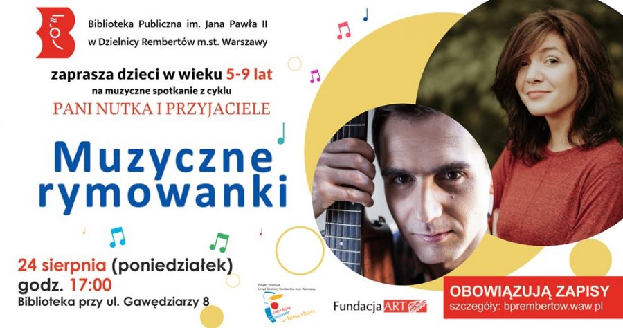 Biblioteka Publiczna im. Jana Pawła II w Dzielnicy Rembertów m.st. Warszawy zaprasza dzieci w wieku 5-9 lat na muzyczne spotkanie z cyklu PANI NUTKA I PRZYJACIELE